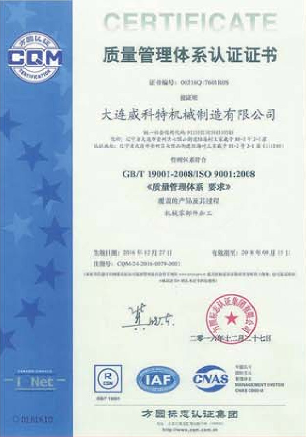 大連威科特成立于2003年,2012年搬遷至大連金州經濟技術開發區。公司注冊資本2500萬元,占地面積25000m2,辦公地點位于大連開發區遼河西路73號融通大廈。公司現擁有員工68人,中高級職稱人數15人,技工30人以上,公司已通過ISO9001:2015質量管理體系認證,擁有多項專利技術,經過多年的發展,逐漸形成了一支素質過硬、制造經驗豐富的管理、技術和生產團隊,保證了公司的持續發展和創新能力。